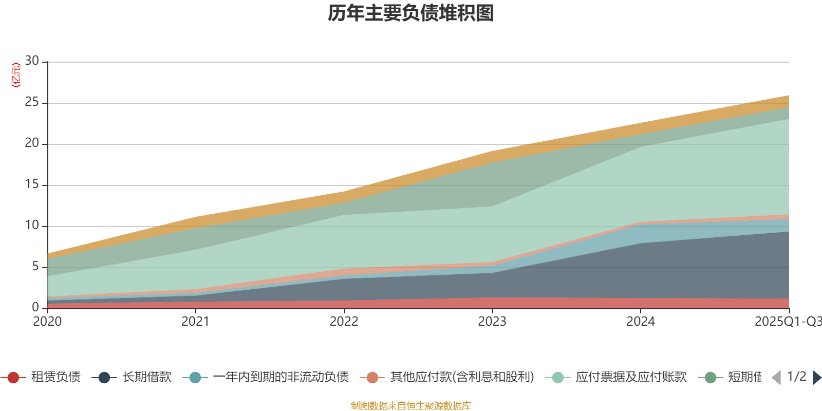 负债重大变化方面,截至2025年三季度末,公司一年内到期的非流动负债较上年末减少34.38%,占公司总资产比重下降2.67个百分点;短期借款较上年末减少8.82%,占公司总资产比重下降0.99个百分点;应付票据及应付账款较上年末增加27.31%,占公司总资产比重上升0.98个百分点;租赁负债较上年末减少4.65%,占公司总资产比重下降0.67个百分点。