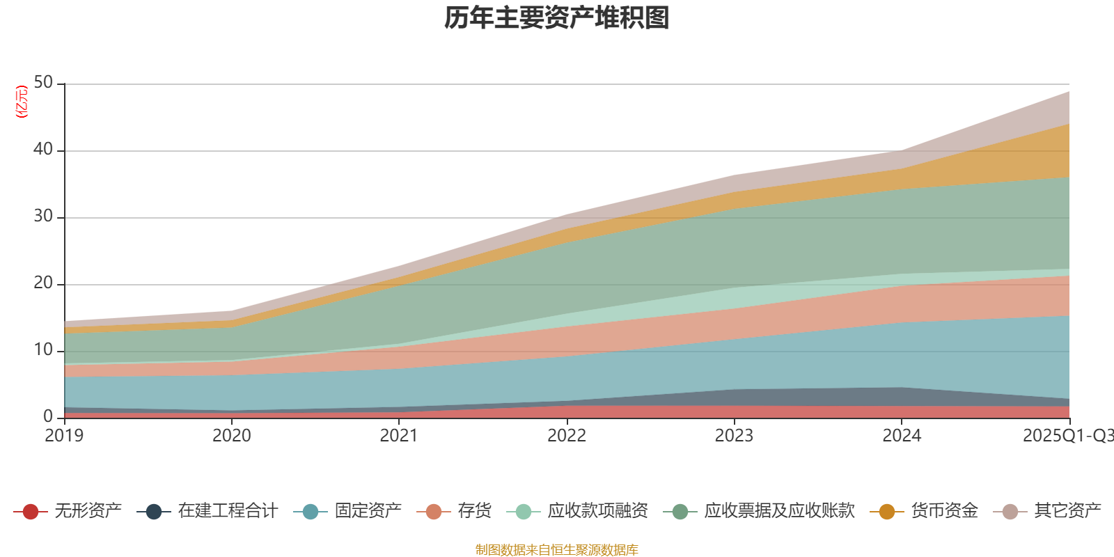 资产重大变化方面,截至2025年三季度末,公司货币资金较上年末增加159.45%,占公司总资产比重上升8.67个百分点;在建工程合计较上年末减少59.37%,占公司总资产比重下降4.67个百分点;交易性金融资产合计较上年末增加10239398%,占公司总资产比重上升4.39个百分点;应收票据及应收账款较上年末增加8.56%,占公司总资产比重下降3.5个百分点。