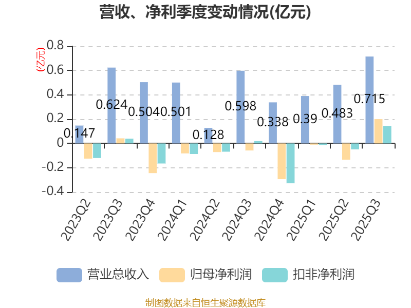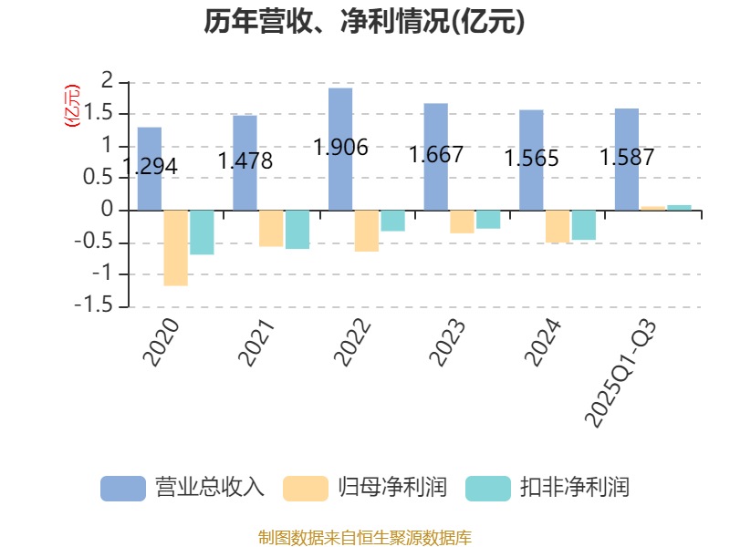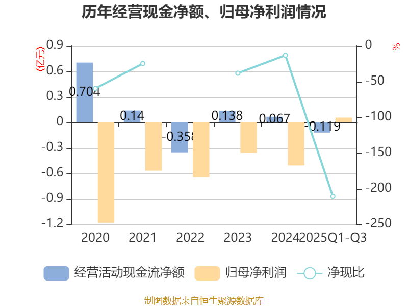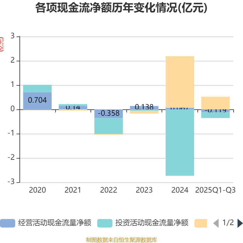 2025年前三季度,公司经营活动现金流净额为-1191.91万元,同比增加692.8万元;筹资活动现金流净额5226.87万元,同比减少2789.08万元;投资活动现金流净额-2378.54万元,上年同期为-1.14亿元。