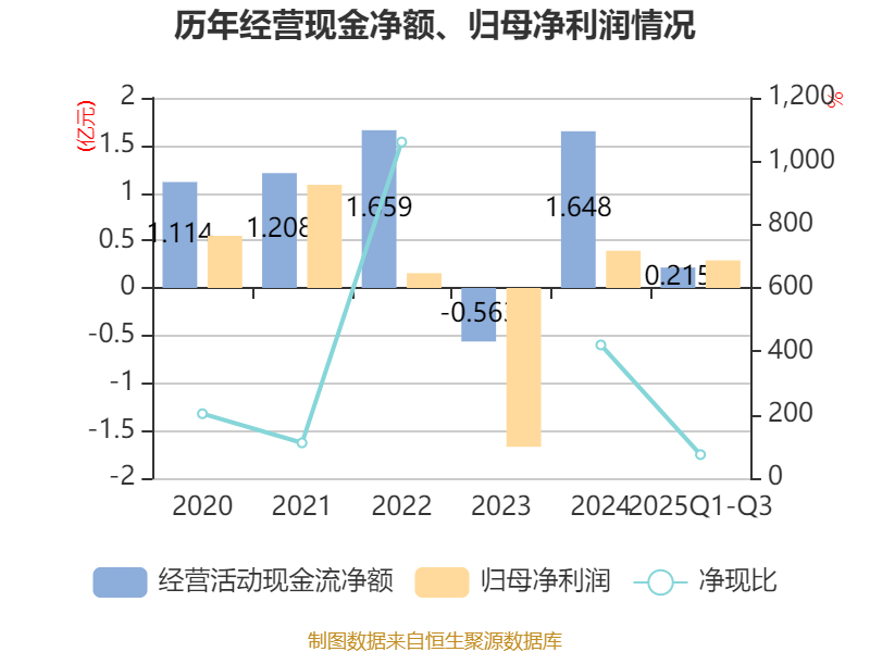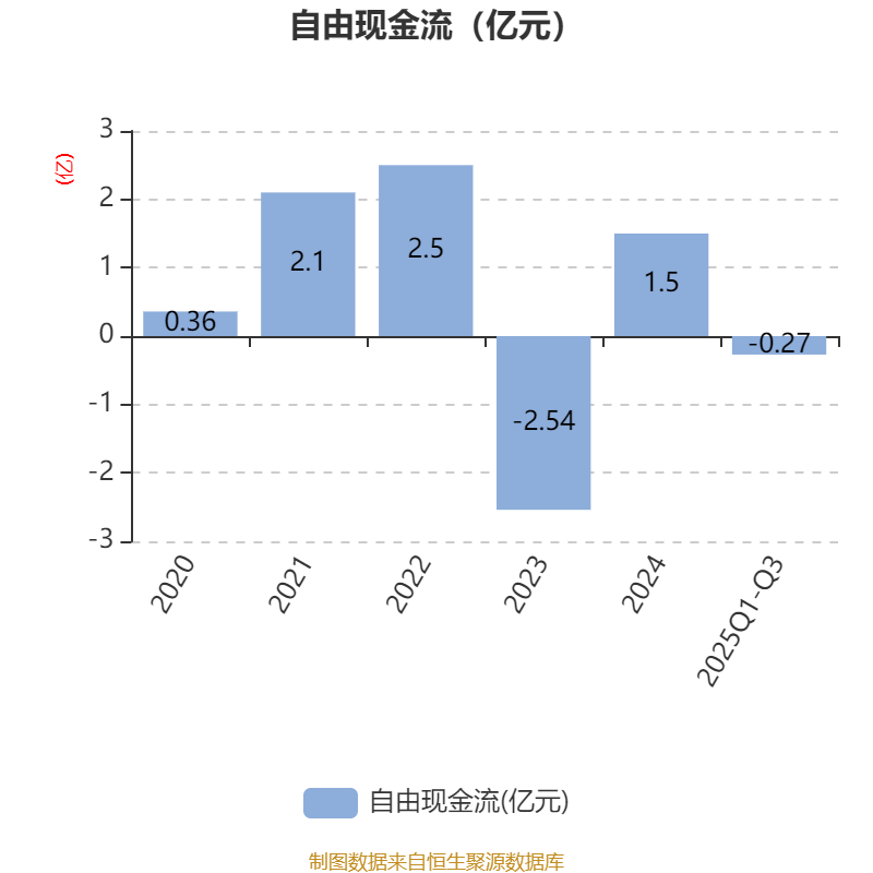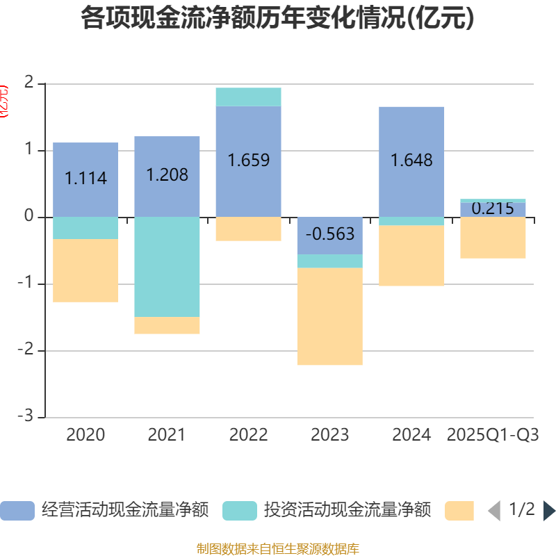 2025年前三季度,公司经营活动现金流净额为2150.52万元,同比增长23.46%;筹资活动现金流净额-6227.66万元,同比减少1581.92万元;投资活动现金流净额537.17万元,上年同期为-865.18万元。