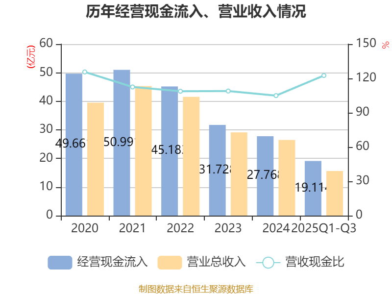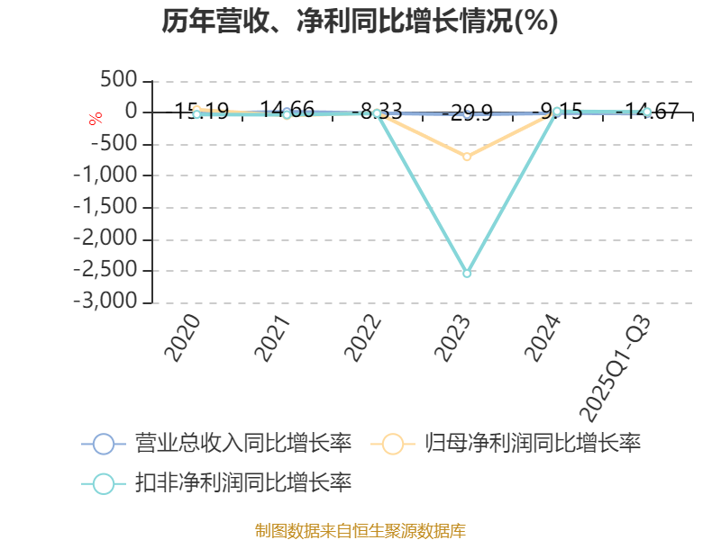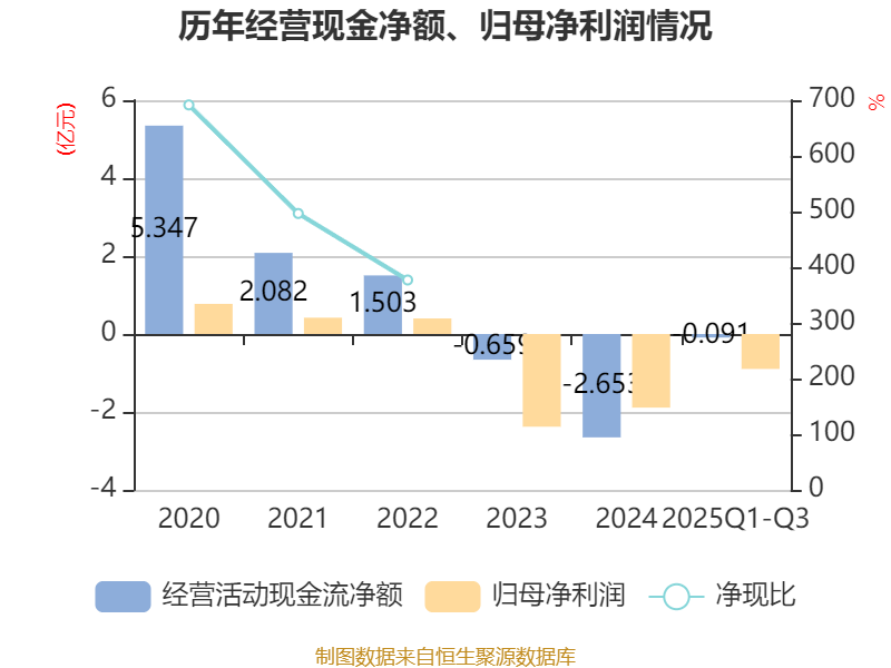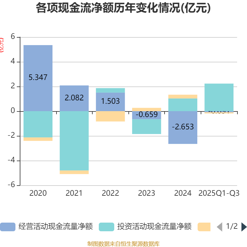 2025年前三季度,公司经营活动现金流净额为-912.77万元,同比增加2.49亿元;筹资活动现金流净额-930.4万元,同比减少2576.41万元;投资活动现金流净额2.23亿元,上年同期为1.23亿元。