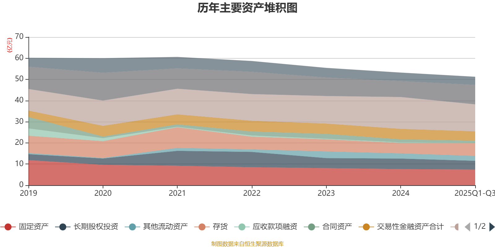 资产重大变化方面,截至2025年三季度末,公司货币资金较上年末增加21.73%,占公司总资产比重上升3.77个百分点;应收票据及应收账款较上年末减少15.22%,占公司总资产比重下降3.37个百分点;存货较上年末增加24.28%,占公司总资产比重上升2.67个百分点;长期股权投资较上年末减少17.21%,占公司总资产比重下降1.3个百分点。