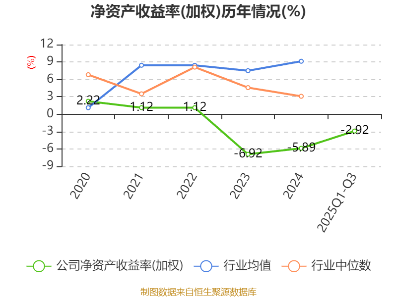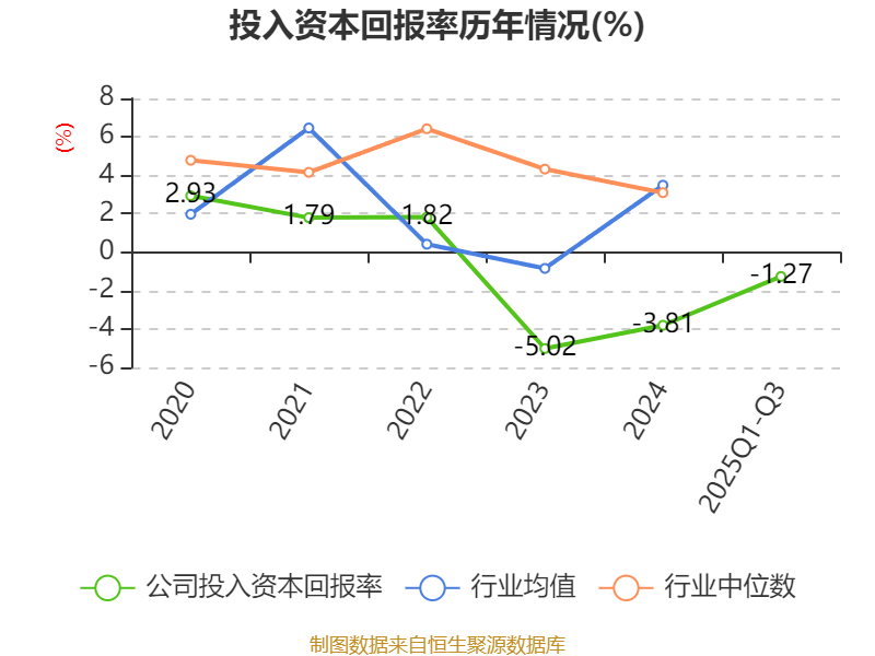 盈利能力方面, 2025年前三季度公司加权平均净资产收益率为-2.92%,同比上升0.12个百分点。公司2025年前三季度投入资本回报率为-1.27%,较上年同期上升0.42个百分点。