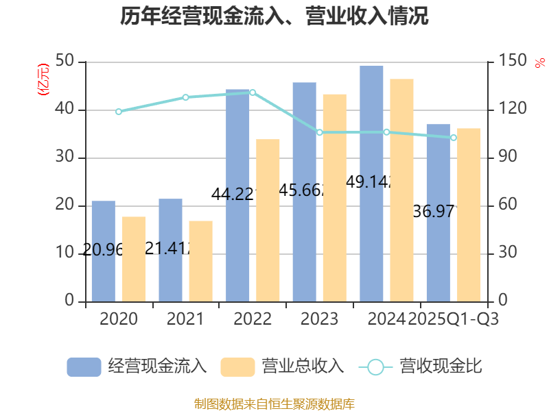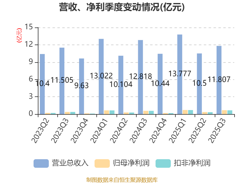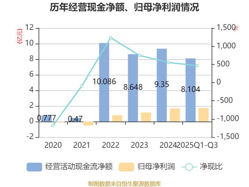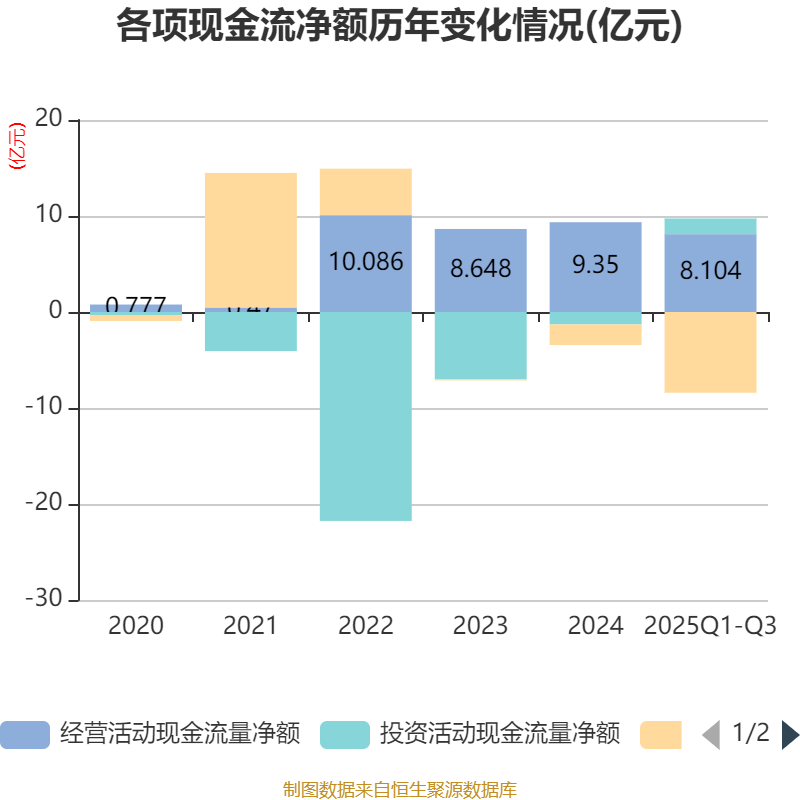 2025年前三季度,公司经营活动现金流净额为8.1亿元,同比增长14.8%;筹资活动现金流净额-8.41亿元,同比减少8.03亿元;投资活动现金流净额1.64亿元,上年同期为-1.73亿元。