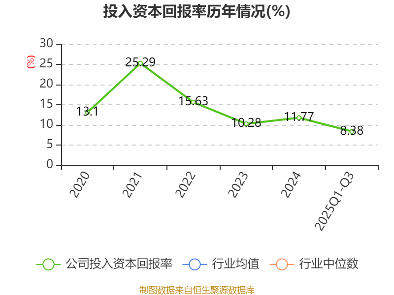 盈利能力方面, 2025年前三季度公司加权平均净资产收益率为8.4%,同比下降0.12个百分点。公司2025年前三季度投入资本回报率为8.38%,较上年同期上升0.45个百分点。