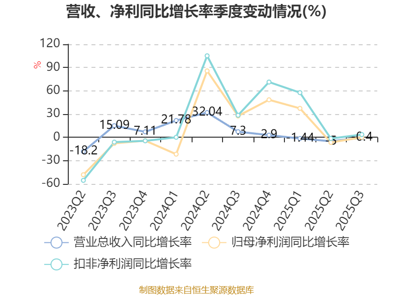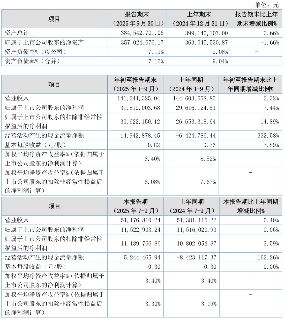 负债重大变化方面,截至2025年三季度末,公司应付票据及应付账款较上年末减少29.71%,占公司总资产比重下降1.39个百分点;应付职工薪酬较上年末减少23.91%,占公司总资产比重下降0.27个百分点;应交税费较上年末减少39.27%,占公司总资产比重下降0.22个百分点;递延所得税负债较上年末增加42.59%,占公司总资产比重上升0.04个百分点。
