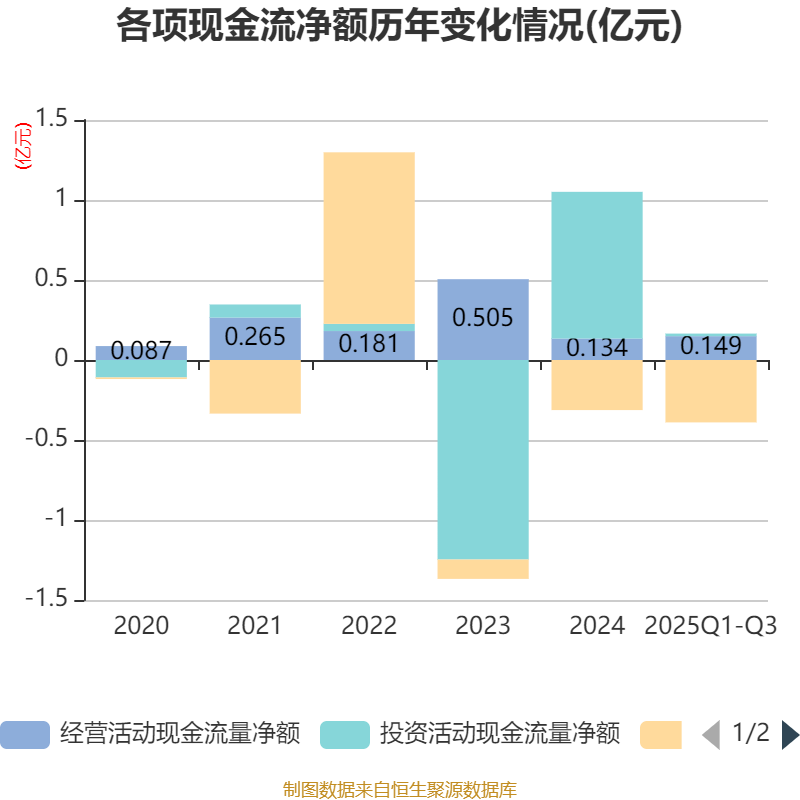 2025年前三季度,公司经营活动现金流净额为1494.29万元,同比增加2136.77万元;筹资活动现金流净额-3900万元,同比减少780万元;投资活动现金流净额160.79万元,上年同期为7233.35万元。