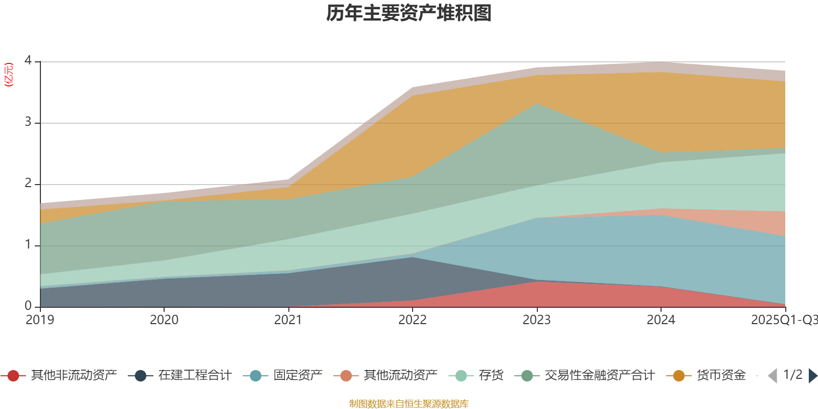 资产重大变化方面,截至2025年三季度末,公司其他流动资产较上年末增加282.04%,占公司总资产比重上升7.89个百分点;其他非流动资产较上年末减少87.63%,占公司总资产比重下降7.13个百分点;存货较上年末增加25.93%,占公司总资产比重上升5.77个百分点;货币资金较上年末减少17.61%,占公司总资产比重下降4.77个百分点。