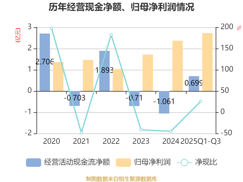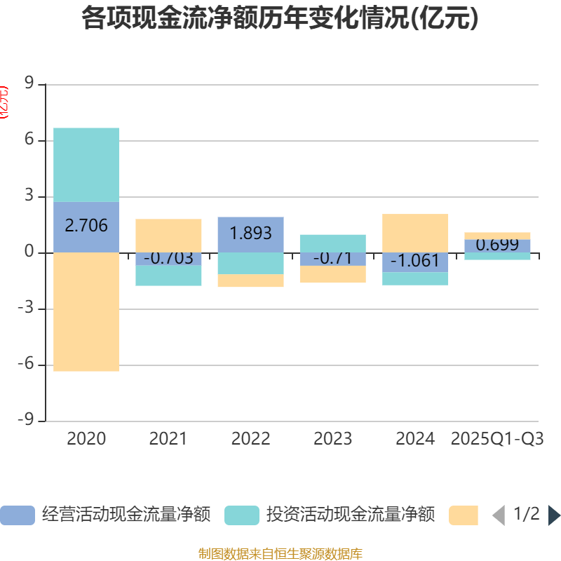 2025年前三季度,公司经营活动现金流净额为6994.05万元,同比增加8334.14万元;筹资活动现金流净额3725.59万元,同比减少6222.38万元;投资活动现金流净额-3964.97万元,上年同期为-5560.68万元。