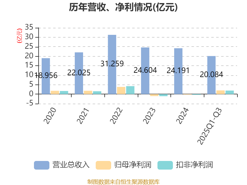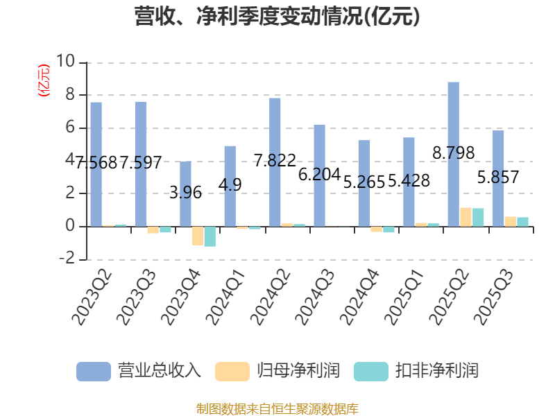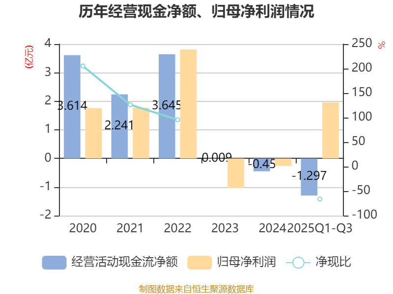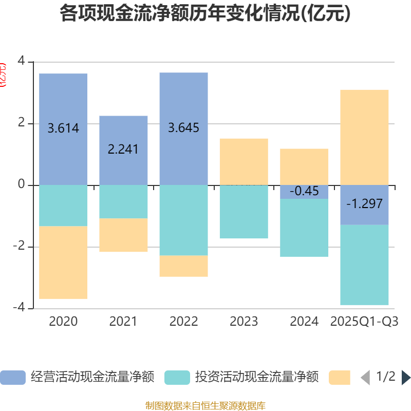 2025年前三季度,公司经营活动现金流净额为-1.3亿元,同比减少1.67亿元;筹资活动现金流净额3.08亿元,同比增加2.87亿元;投资活动现金流净额-2.6亿元,上年同期为-2.74亿元。