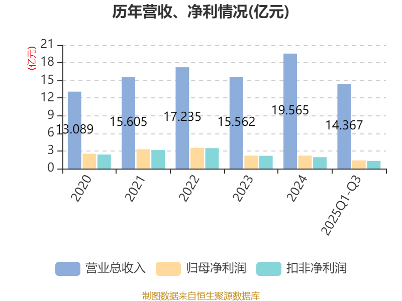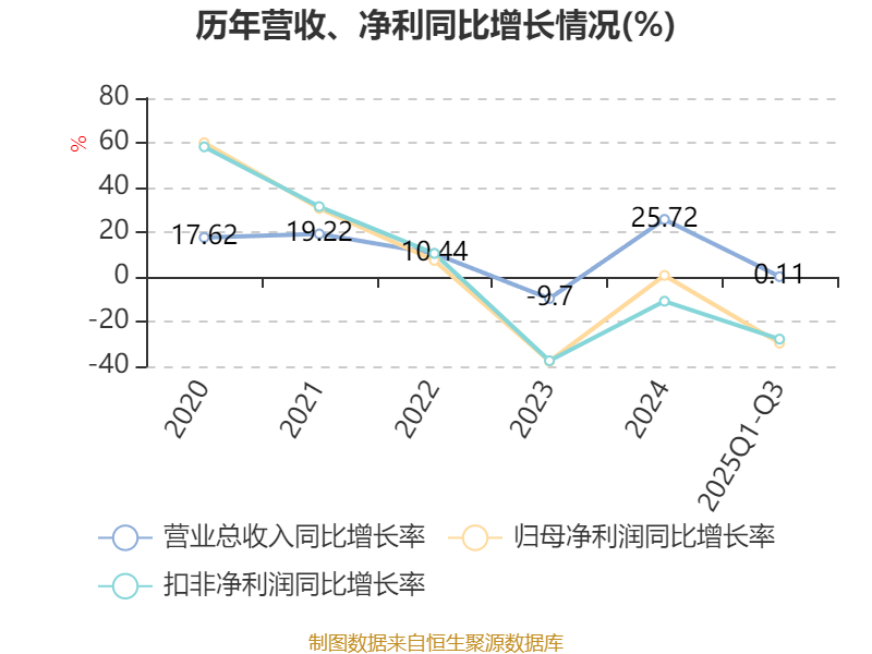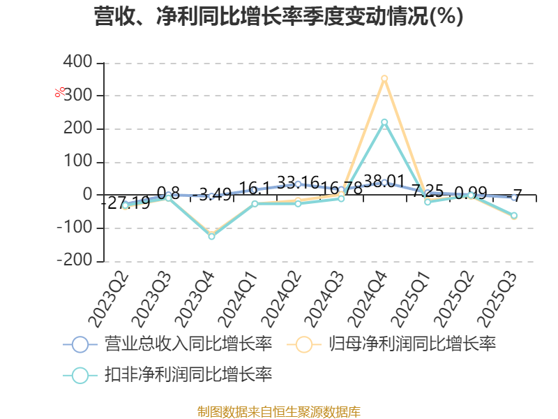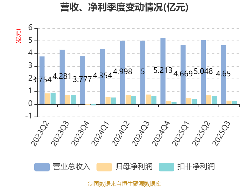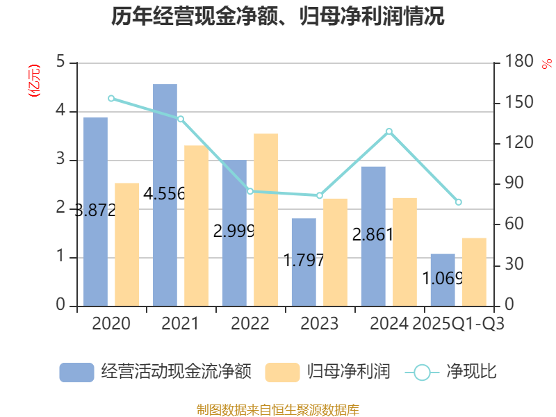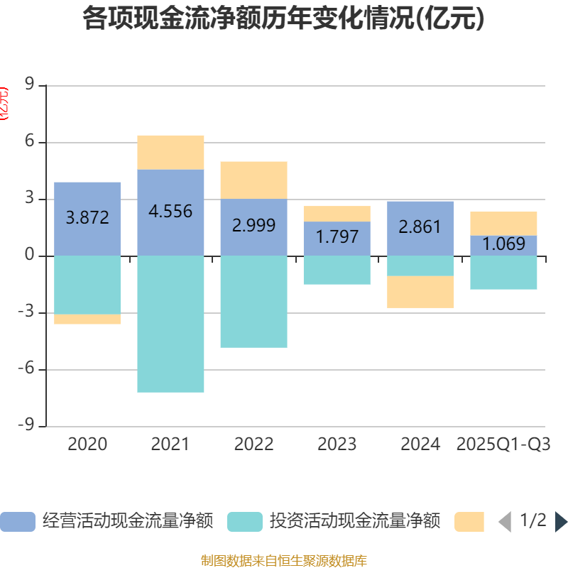 2025年前三季度,公司经营活动现金流净额为1.07亿元,同比下降50.37%;筹资活动现金流净额1.26亿元,同比增加2.41亿元;投资活动现金流净额-1.79亿元,上年同期为-2128.5万元。
