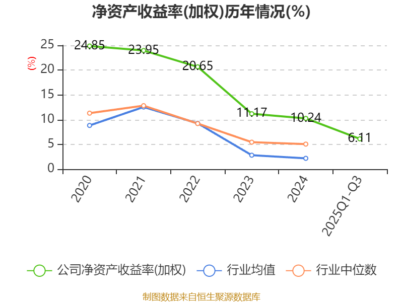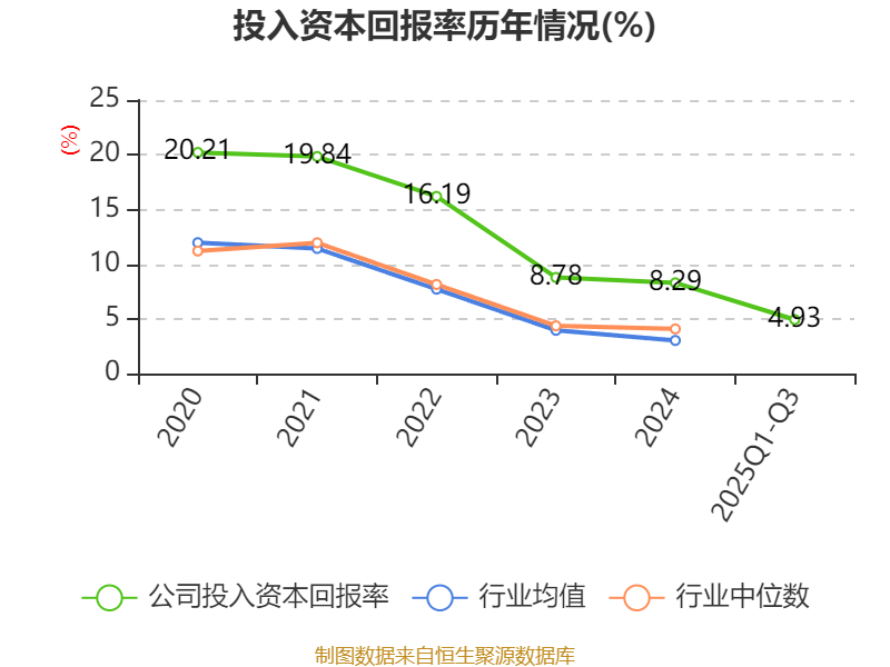 盈利能力方面, 2025年前三季度公司加权平均净资产收益率为6.11%,同比下降3.04个百分点。公司2025年前三季度投入资本回报率为4.93%,较上年同期下降2.21个百分点。