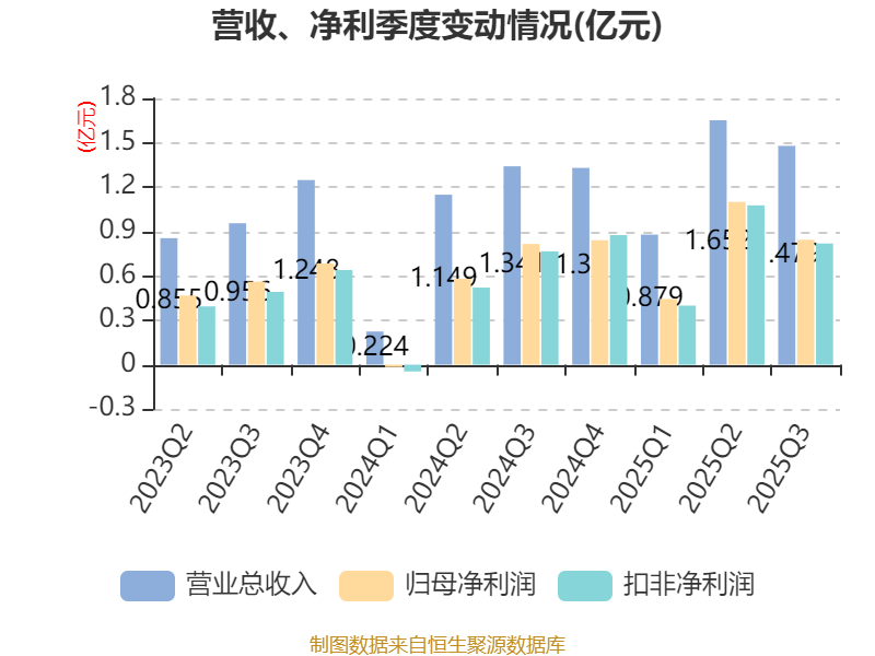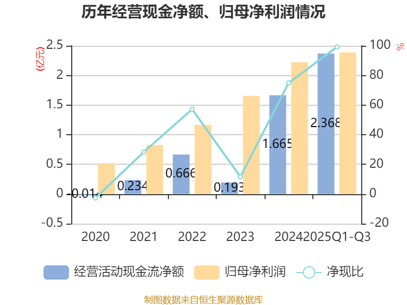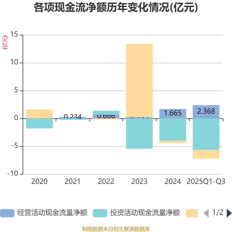 2025年前三季度,公司经营活动现金流净额为2.37亿元,同比增长88.06%;筹资活动现金流净额-1.57亿元,同比减少9679.48万元;投资活动现金流净额-5.66亿元,上年同期为-3.23亿元。