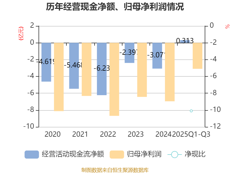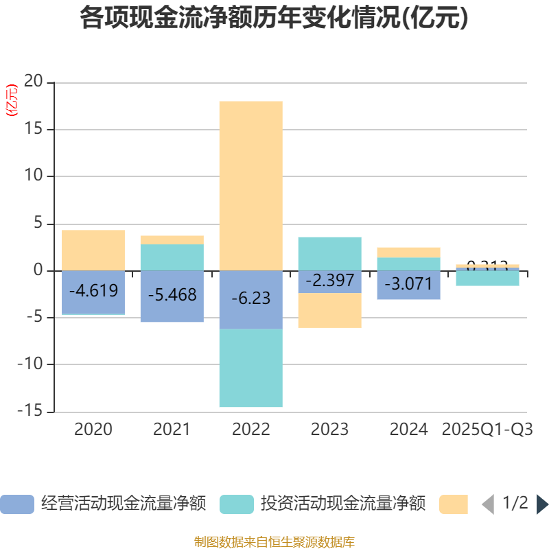2025年前三季度,公司经营活动现金流净额为3125.86万元,同比增加2.23亿元;筹资活动现金流净额3360.66万元,同比减少4602.36万元;投资活动现金流净额-1.62亿元,上年同期为-3999.31万元。