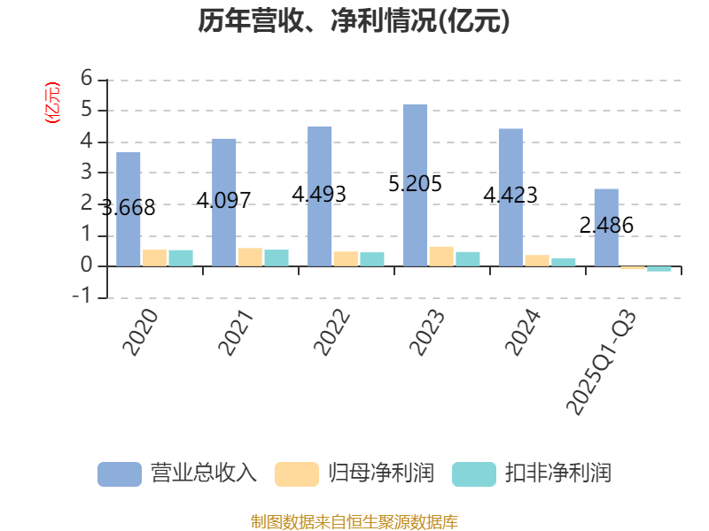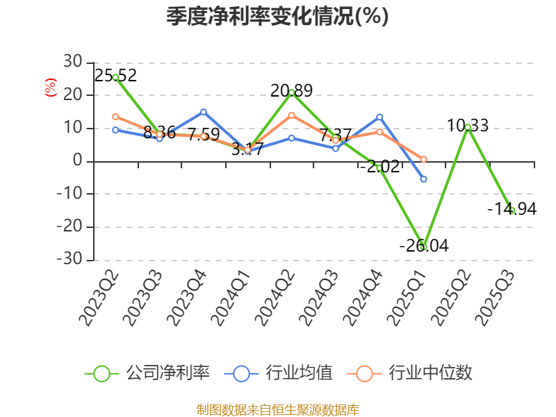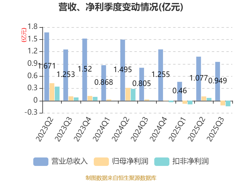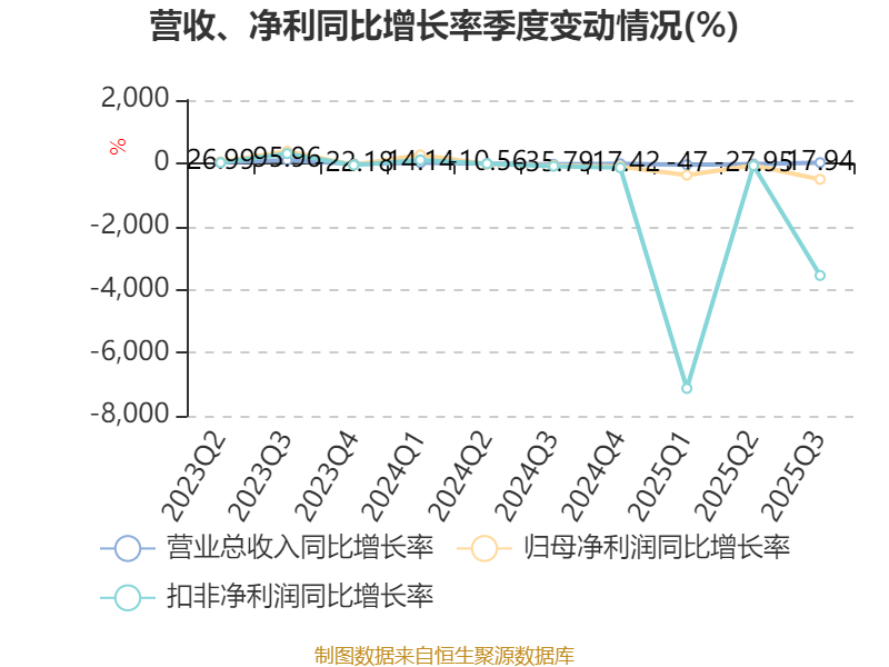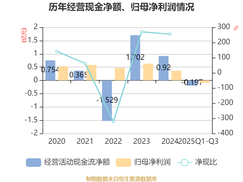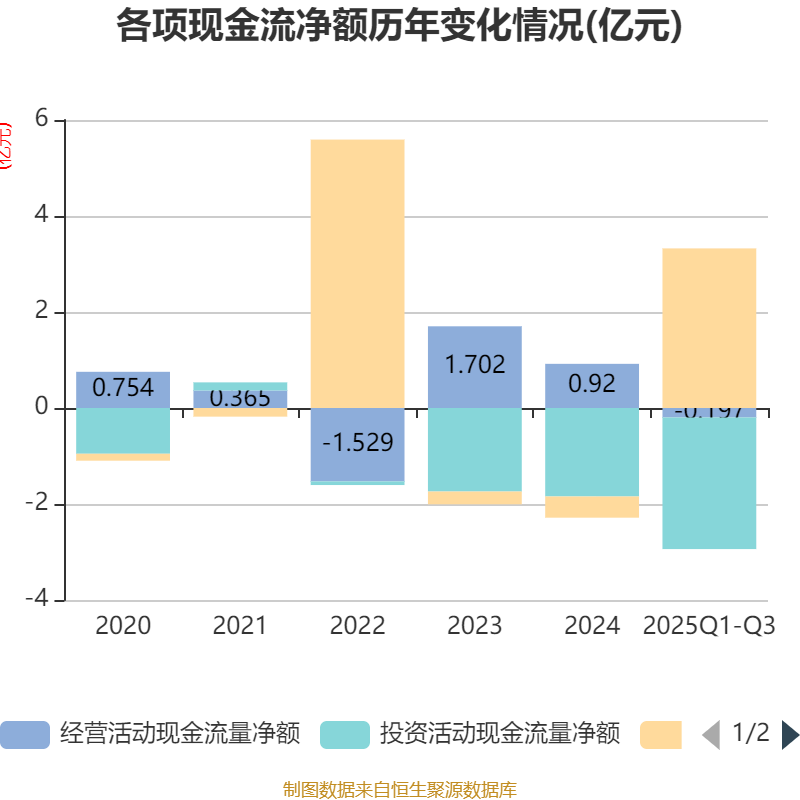 2025年前三季度,公司经营活动现金流净额为-1969.39万元,同比减少4211.36万元;筹资活动现金流净额3.32亿元,同比增加3.74亿元;投资活动现金流净额-2.74亿元,上年同期为-2.31亿元。