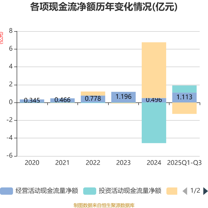 2025年前三季度,公司经营活动现金流净额为1.11亿元,同比增长146.09%;筹资活动现金流净额-1.28亿元,同比减少7.69亿元;投资活动现金流净额8001.64万元,上年同期为-3.02亿元。