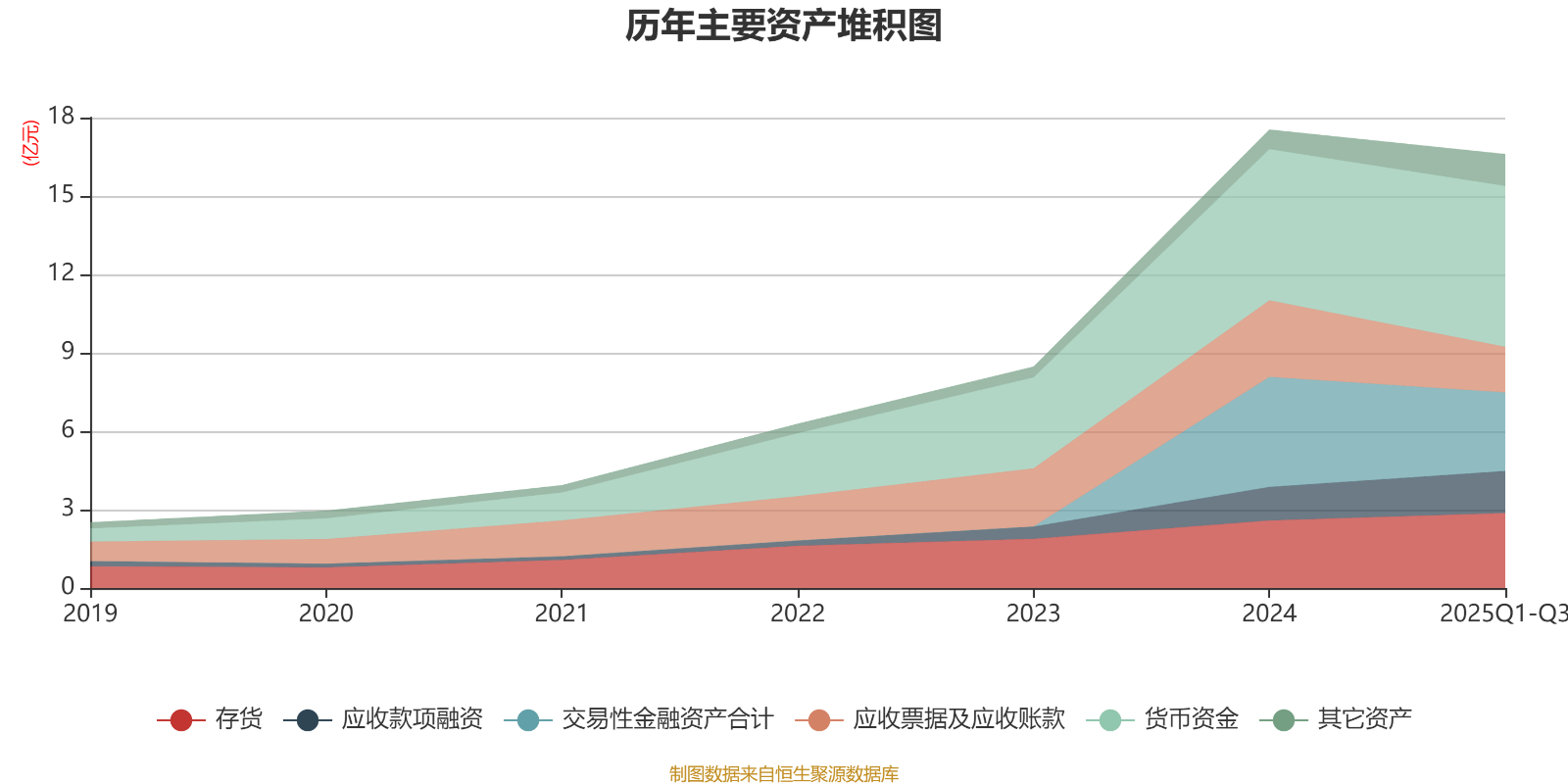 资产重大变化方面,截至2025年三季度末,公司应收票据及应收账款较上年末减少40.49%,占公司总资产比重下降6.21个百分点;交易性金融资产合计较上年末减少28.53%,占公司总资产比重下降5.88个百分点;货币资金较上年末增加6.43%,占公司总资产比重上升4.1个百分点;存货较上年末增加11.03%,占公司总资产比重上升2.54个百分点。