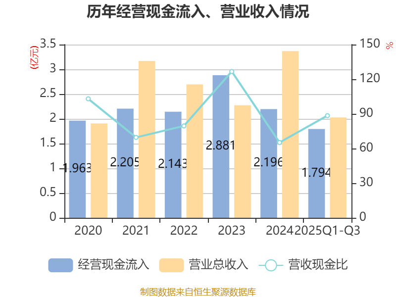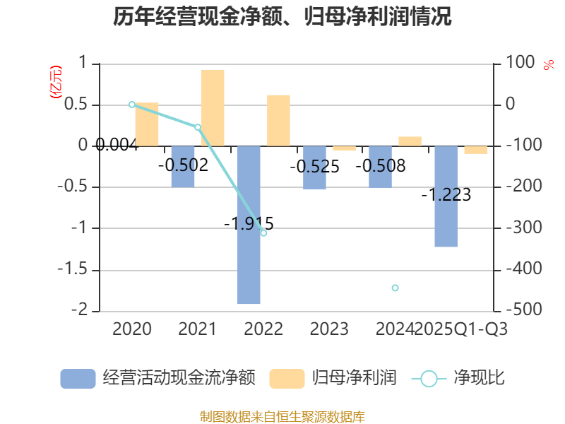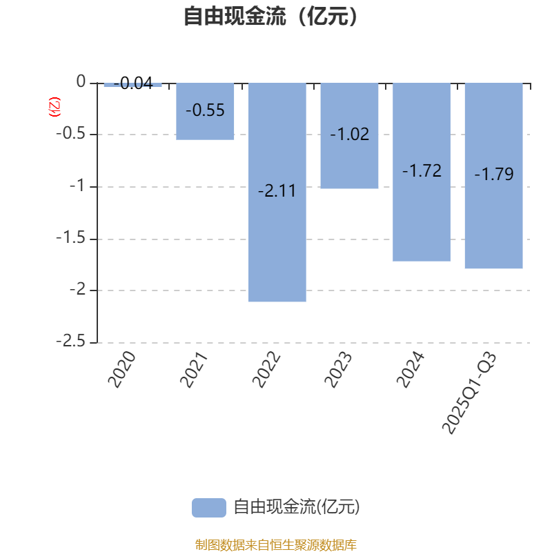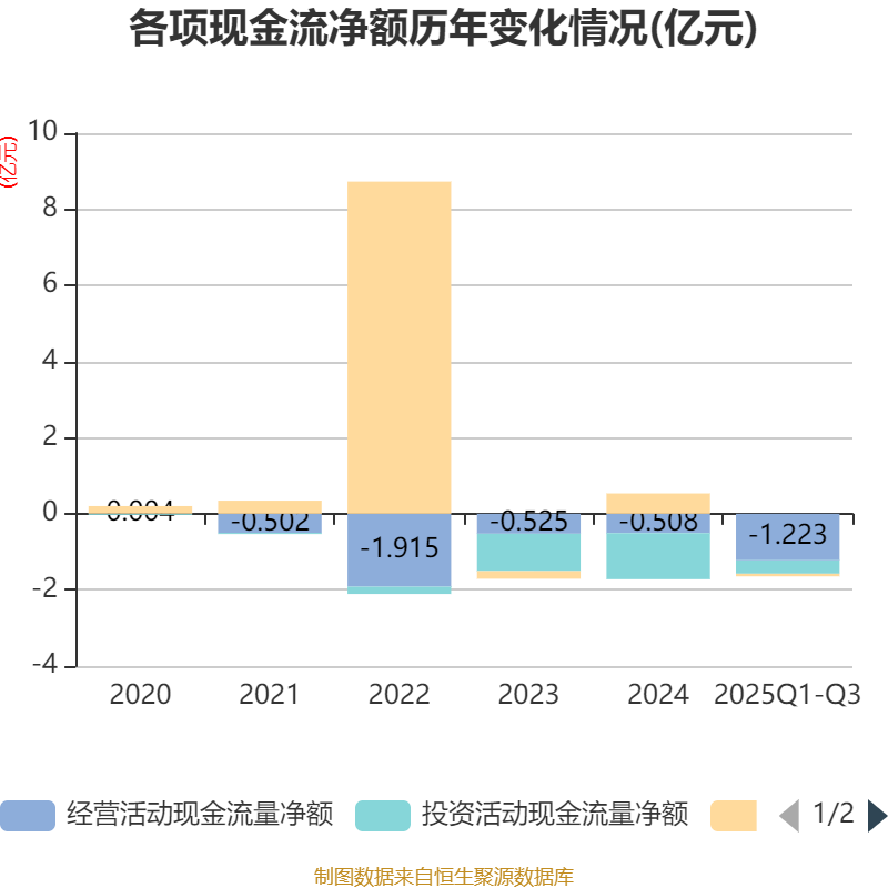 2025年前三季度,公司经营活动现金流净额为-1.22亿元,同比减少2799.61万元;筹资活动现金流净额-694.95万元,同比增加213.11万元;投资活动现金流净额-3516.97万元,上年同期为-4739.12万元。