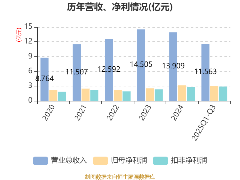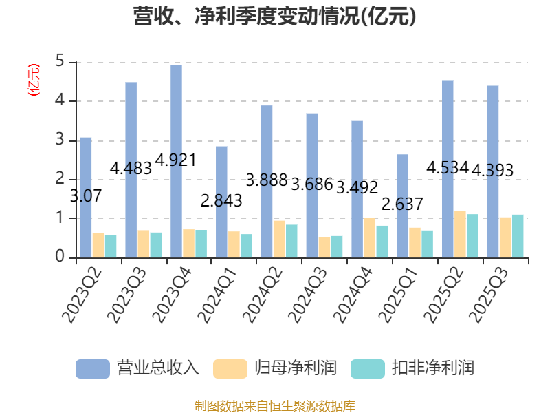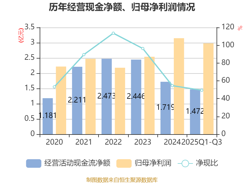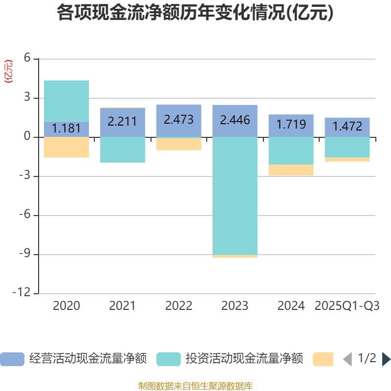 2025年前三季度,公司经营活动现金流净额为1.47亿元,同比增长133.82%;筹资活动现金流净额-3083.53万元,同比增加1735.18万元;投资活动现金流净额-1.59亿元,上年同期为-1.38亿元。
