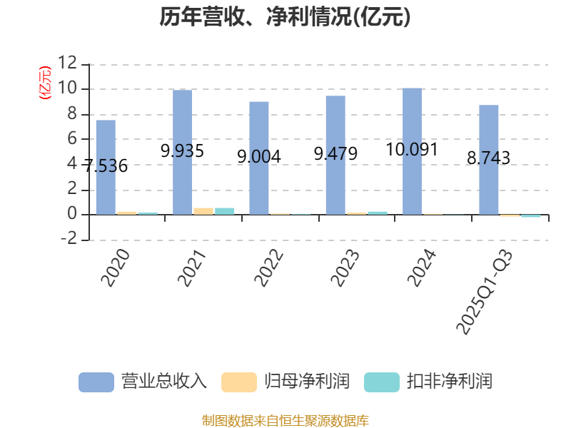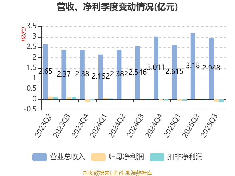 中证智能财讯锦鸡股份(300798)10月29日披露2025年第三季度报告。前三季度公司实现营业总收入8.74亿元,同比增长23.49%;归母净利润亏损1522.17万元,上年同期盈利882.62万元;扣非净利润亏损2016.01万元,上年同期盈利771.05万元;经营活动产生的现金流量净额为-3625.78万元,上年同期为-5231.99万元;报告期内,锦鸡股份基本每股收益为-0.0325元,加权平均净资产收益率为-0.88%。