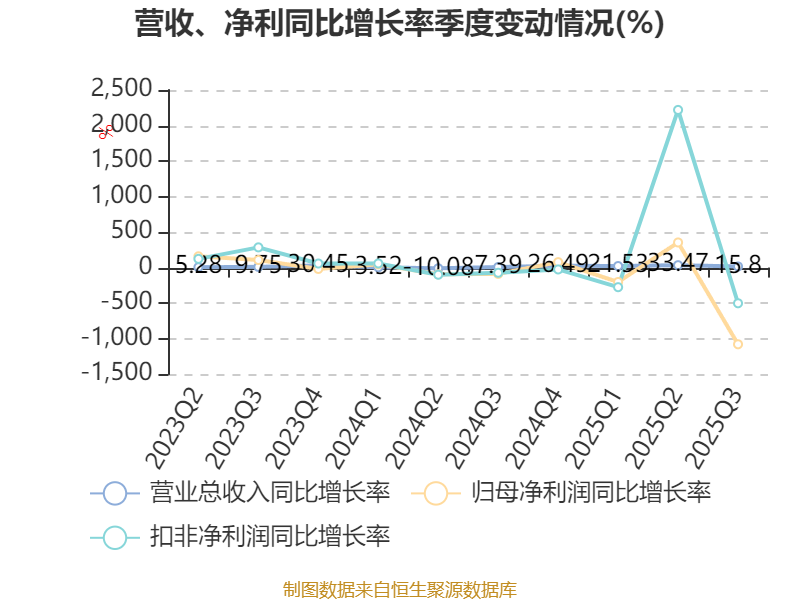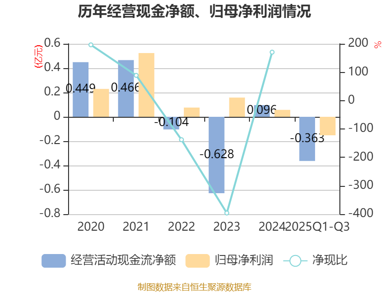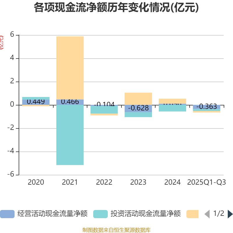 2025年前三季度,公司经营活动现金流净额为-3625.78万元,同比增加1606.21万元;筹资活动现金流净额-1328.89万元,同比减少1.03亿元;投资活动现金流净额-1623.03万元,上年同期为-4141.56万元。