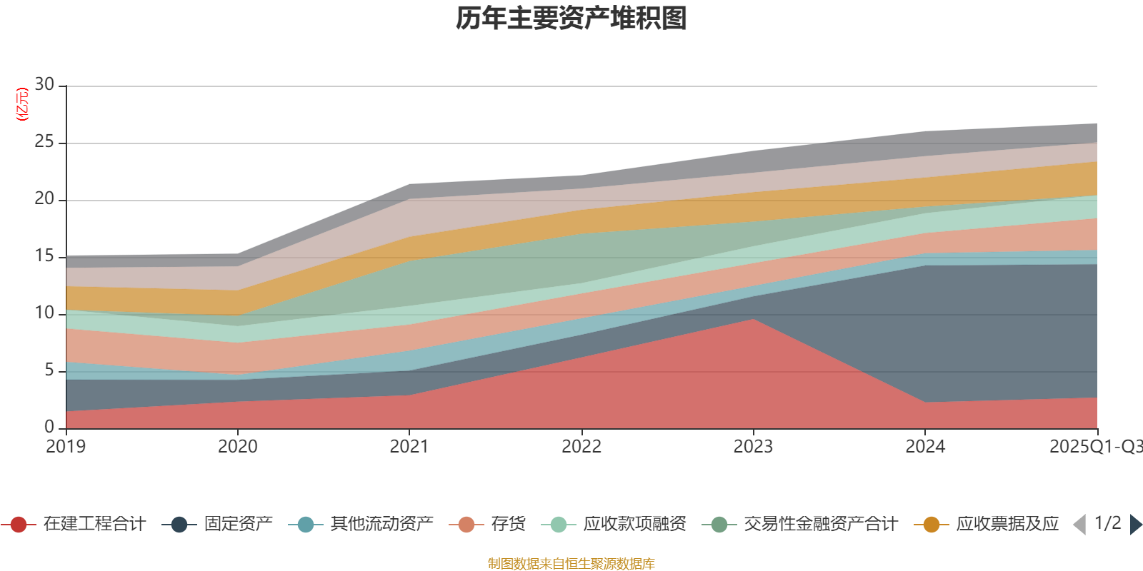 资产重大变化方面,截至2025年三季度末,公司存货较上年末增加57.14%,占公司总资产比重上升3.6个百分点;使用权资产较上年末减少98.25%,占公司总资产比重下降2.62个百分点;固定资产较上年末减少2.56%,占公司总资产比重下降2.33个百分点;交易性金融资产合计较上年末减少100%,占公司总资产比重下降2.19个百分点。