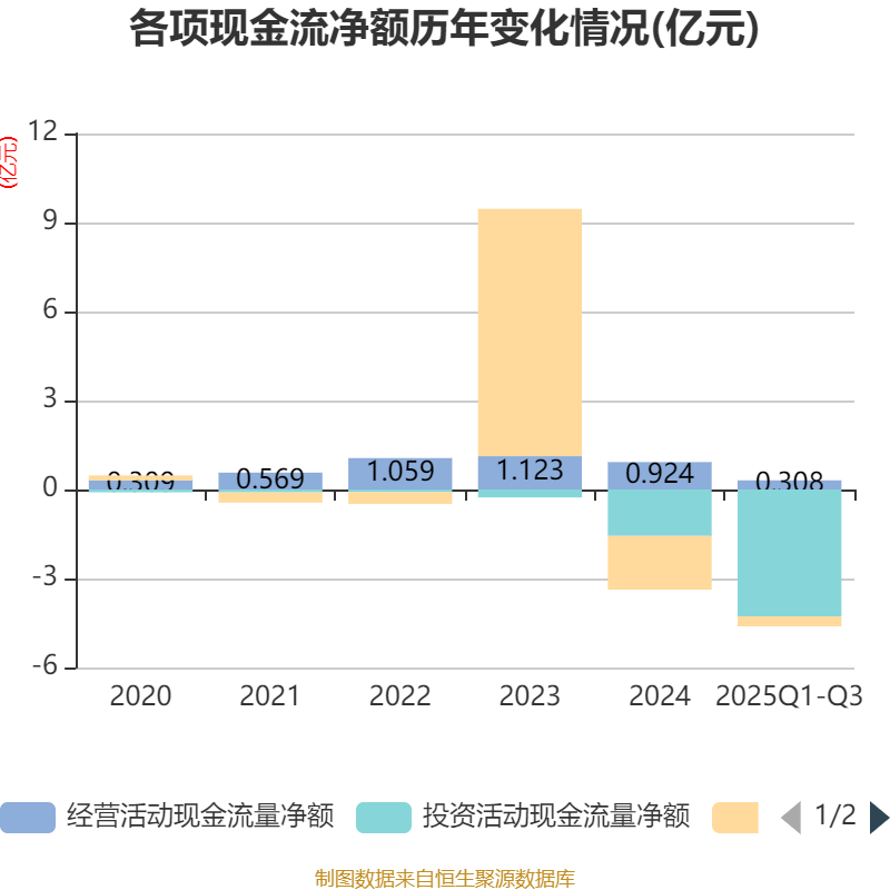 2025年前三季度,公司经营活动现金流净额为3077.2万元,同比下降55.67%;筹资活动现金流净额-3350.65万元,同比增加1.49亿元;投资活动现金流净额-4.28亿元,上年同期为-2.63亿元。