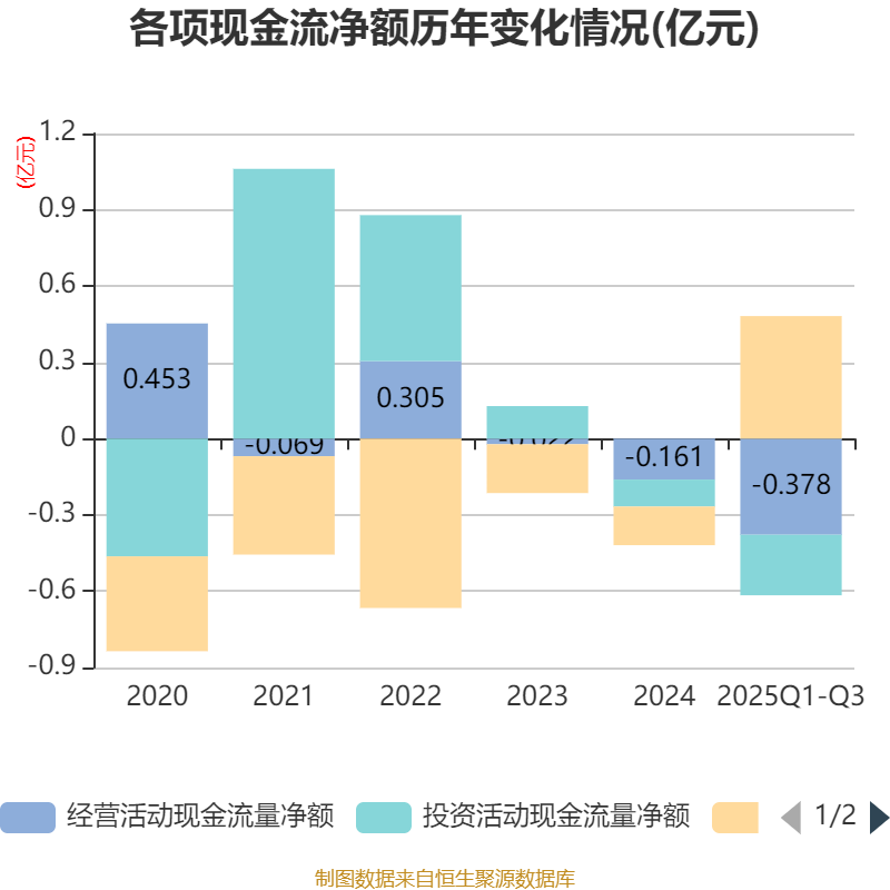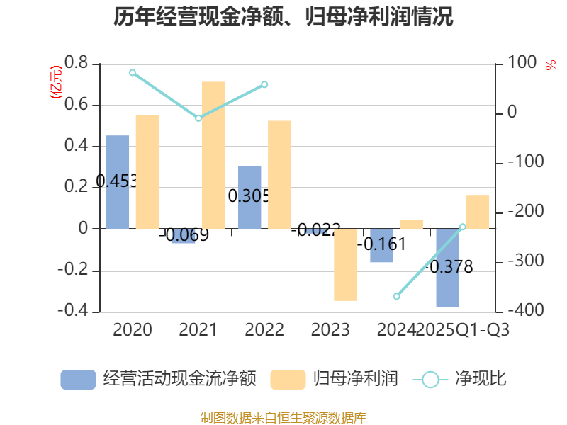 2025年前三季度,公司经营活动现金流净额为-3775.44万元,同比减少200.38万元;筹资活动现金流净额4822万元,同比增加1.02亿元;投资活动现金流净额-2376.65万元,上年同期为-45.61万元。