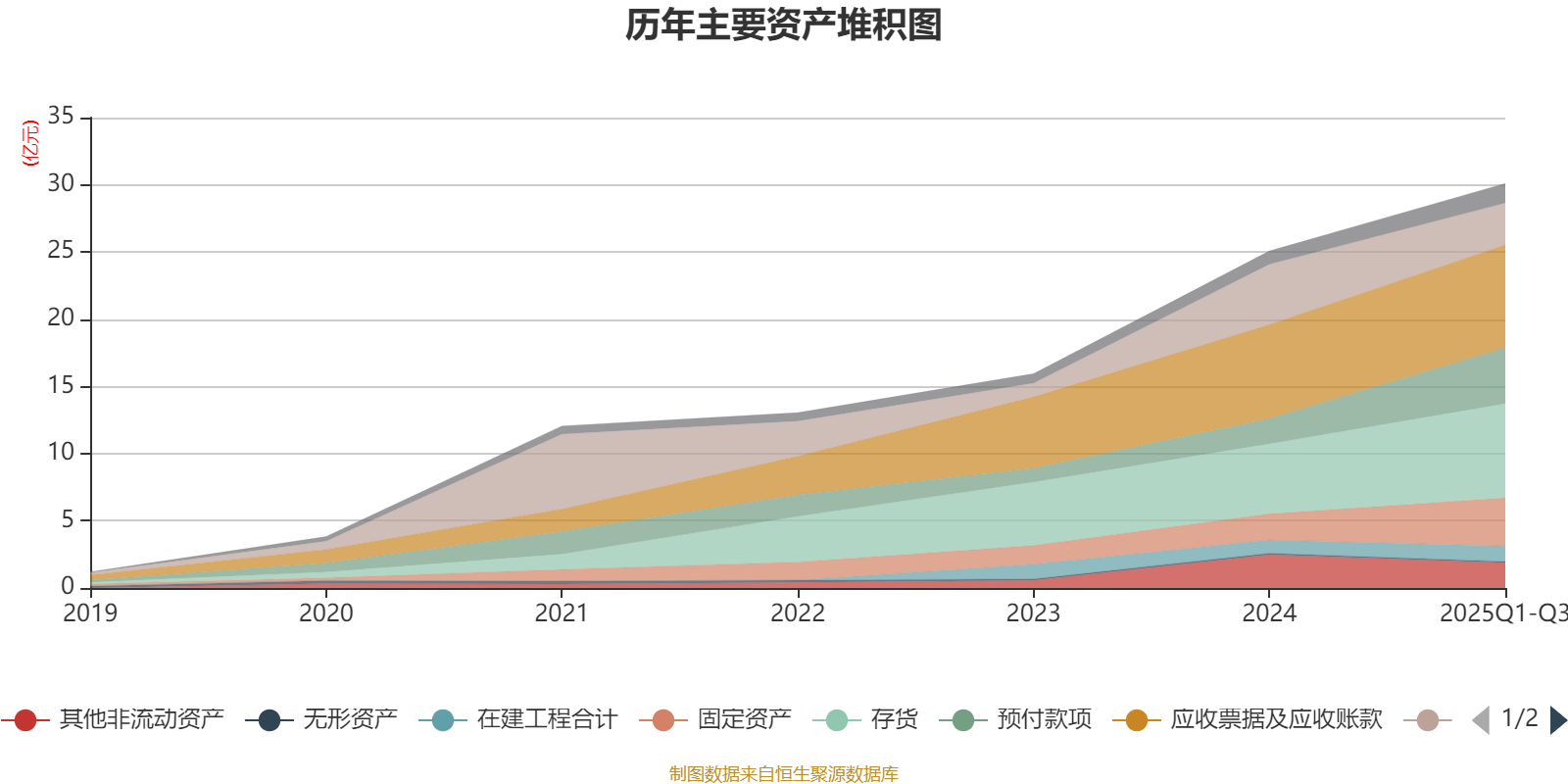 资产重大变化方面,截至2025年三季度末,公司货币资金较上年末减少30.42%,占公司总资产比重下降7.52个百分点;预付款项较上年末增加121.25%,占公司总资产比重上升6.33个百分点;固定资产较上年末增加84.54%,占公司总资产比重上升4.16个百分点;其他非流动资产较上年末减少24.29%,占公司总资产比重下降3.66个百分点。