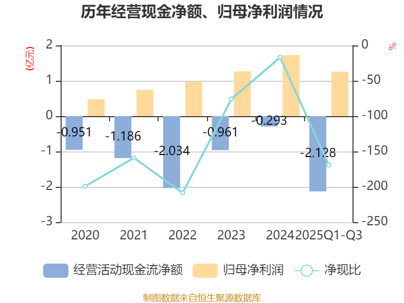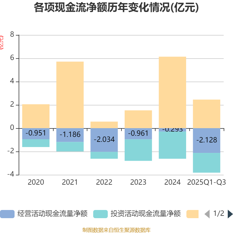 2025年前三季度,公司经营活动现金流净额为-2.13亿元,同比减少6809.56万元;筹资活动现金流净额2.45亿元,同比减少5.26亿元;投资活动现金流净额-1.69亿元,上年同期为-1.04亿元。
