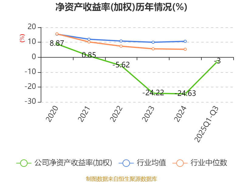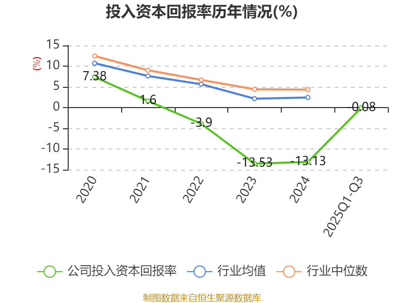盈利能力方面, 2025年前三季度公司加权平均净资产收益率为-3%,同比下降2.15个百分点。公司2025年前三季度投入资本回报率为-0.08%,较上年同期下降1.26个百分点。
