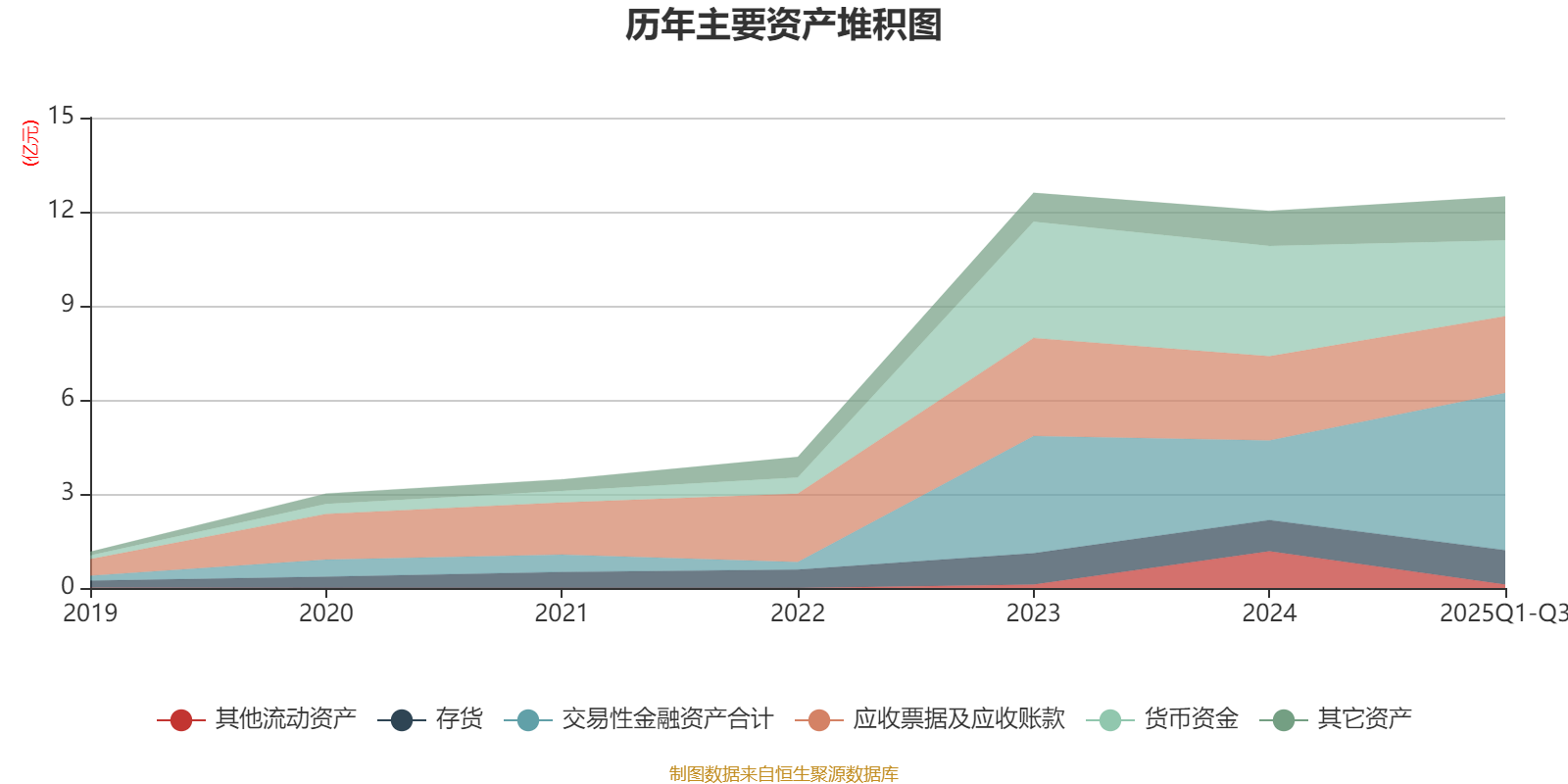 资产重大变化方面,截至2025年三季度末,公司交易性金融资产合计较上年末增加97.4%,占公司总资产比重上升19.05个百分点;货币资金较上年末减少31.2%,占公司总资产比重下降9.86个百分点;其他流动资产较上年末减少90.7%,占公司总资产比重下降8.85个百分点;应收票据及应收账款较上年末减少8.92%,占公司总资产比重下降2.74个百分点。