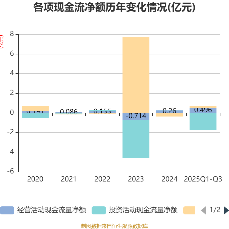 2025年前三季度,公司经营活动现金流净额为4957.43万元,同比增加5138.78万元;筹资活动现金流净额1923.02万元,同比增加5679.81万元;投资活动现金流净额-1.73亿元,上年同期为-1.33亿元。