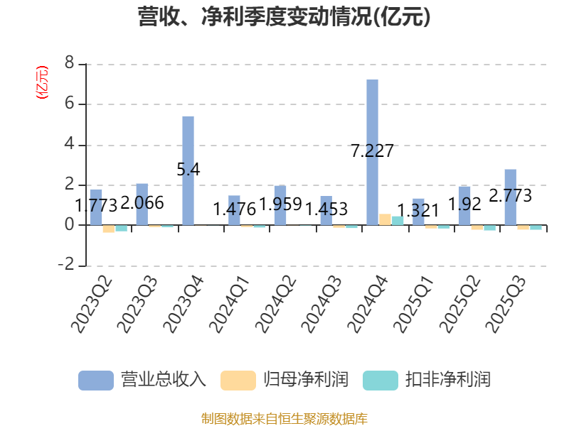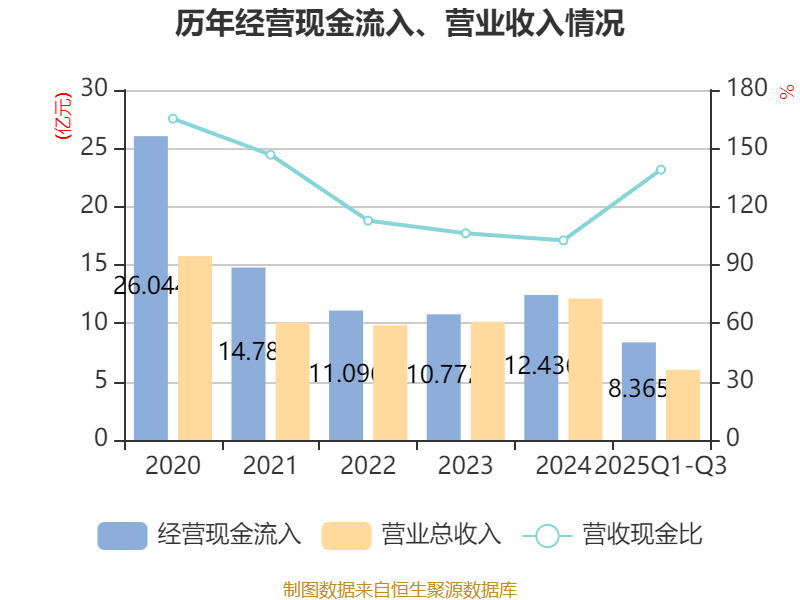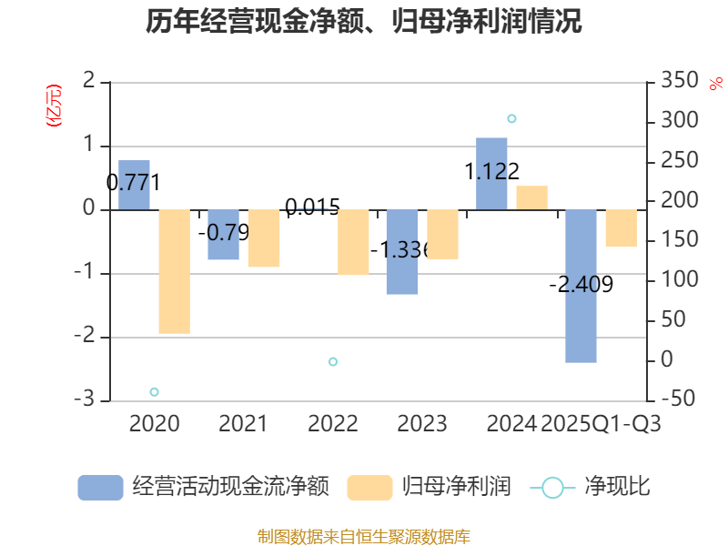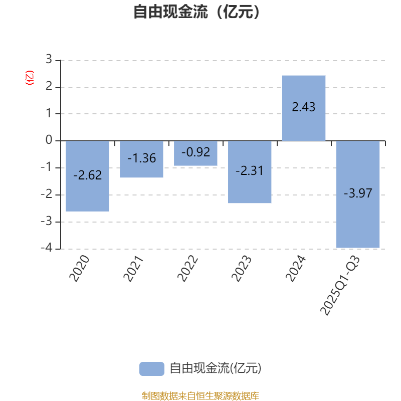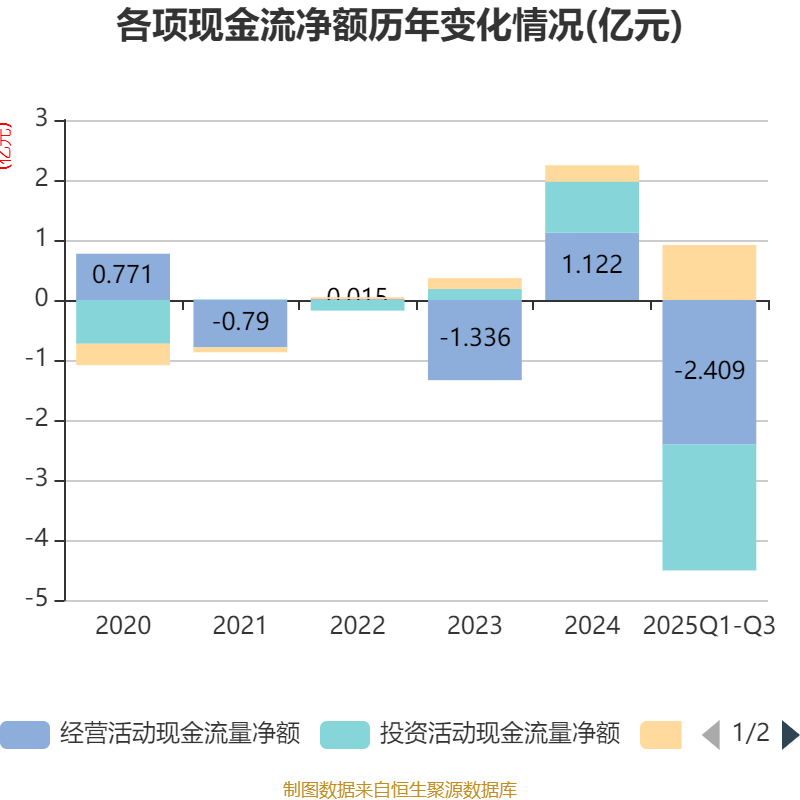 2025年前三季度,公司经营活动现金流净额为-2.41亿元,同比减少1.09亿元;筹资活动现金流净额9169.5万元,同比增加6518.46万元;投资活动现金流净额-2.1亿元,上年同期为1.12亿元。
