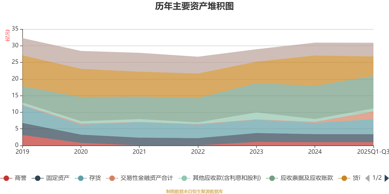 资产重大变化方面,截至2025年三季度末,公司货币资金较上年末减少36.32%,占公司总资产比重下降10.72个百分点;交易性金融资产合计较上年末增加683.32%,占公司总资产比重上升6.65个百分点;存货较上年末增加32.46%,占公司总资产比重上升3.59个百分点;预付款项较上年末增加113.15%,占公司总资产比重上升0.52个百分点。