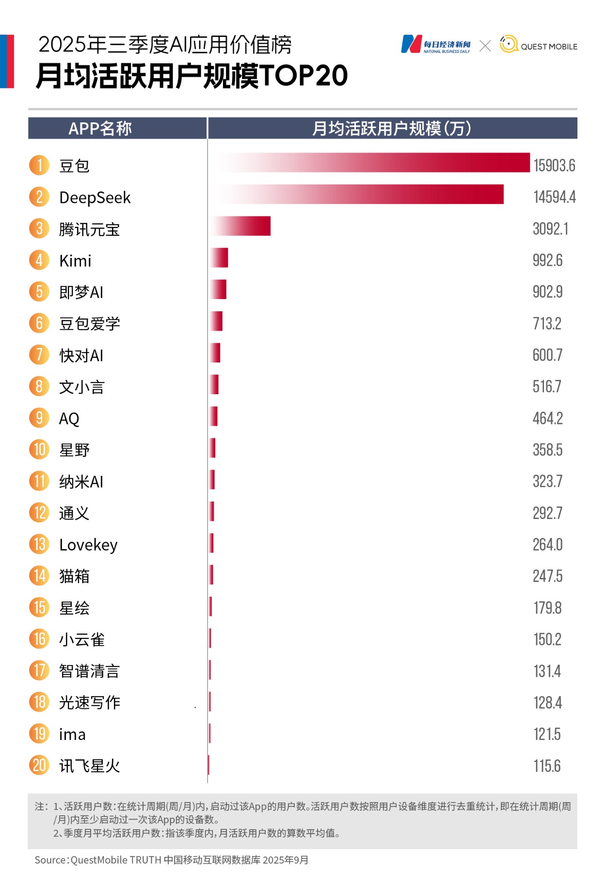 2025年第三季度,AI应用市场呈现出明显的两极分化。《每日经济新闻》联合QuestMobile推出《2025年三季度AI应用价值榜》,基于月均下载量与月活跃用户数(以下简称“月活”)两大核心指标,揭示AI应用“下半场”的新变局。