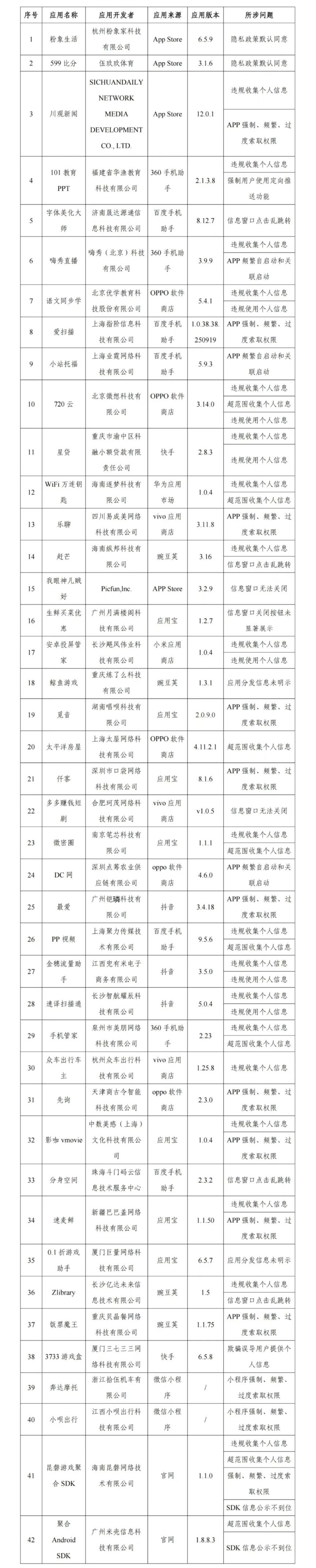 根据中央网信办、工业和信息化部、公安部、市场监管总局等四部门联合发布的《关于开展2025年个人信息保护系列专项行动的公告》,工信部对App、SDK违法违规收集使用个人信息等问题开展治理。近期,经组织第三方检测机构进行抽查,共发现42款App及SDK存在侵害用户权益行为,现予以通报。