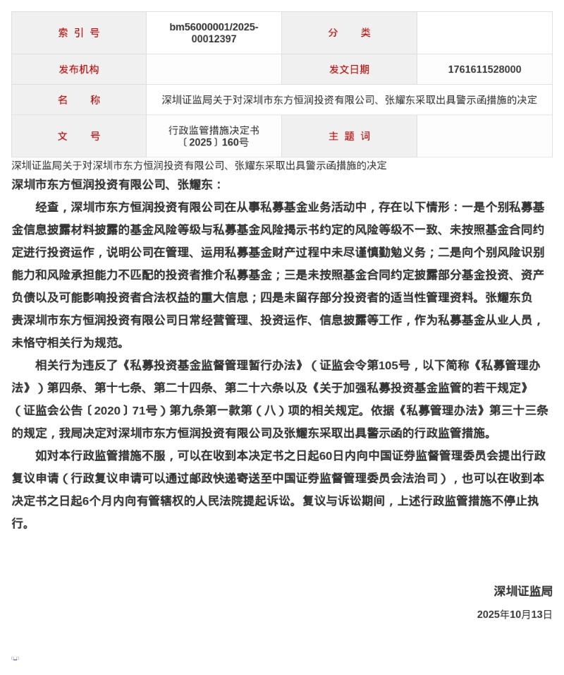 针对以上问题,深圳证监局决定对深圳市东方恒润投资有限公司及张耀东采取出具警示函的行政监管措施。