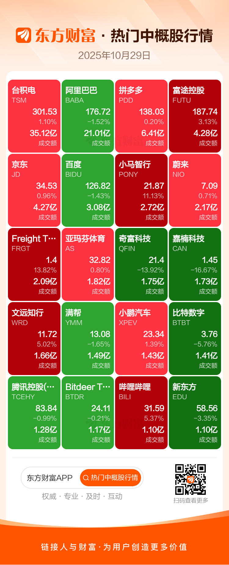 台积电涨1.10%阿里巴巴跌1.52%拼多多涨0.20%富途控股涨3.13%京东涨0.96%百度跌1.43%小马智行涨11.13%蔚来涨0.71%Freight Technologies Inc涨13.82%亚玛芬体育涨0.80%