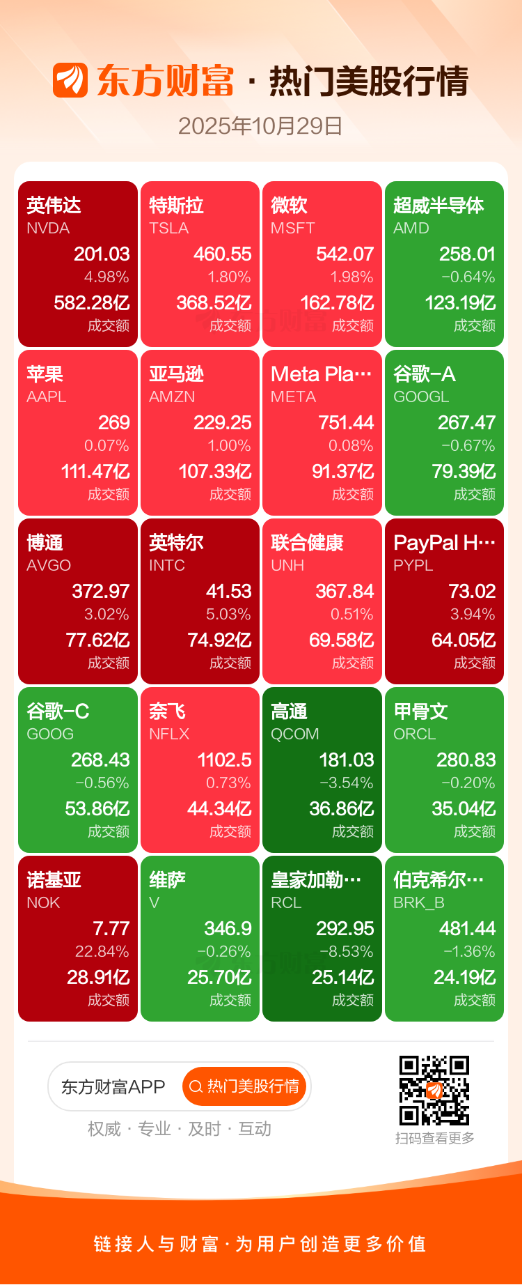 英伟达涨4.98%特斯拉涨1.80%微软涨1.98%超威半导体跌0.64%苹果涨0.07%亚马逊涨1.00%Meta Platforms Inc-A涨0.08%谷歌-A跌0.67%博通涨3.02%英特尔涨5.03%