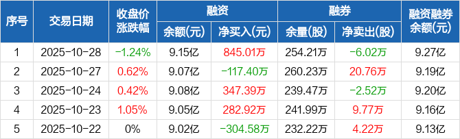 西南证券:融资净买入845.01万元,融资余额9.15亿元(10-28)
