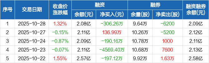 嘉友国际融资融券信息显示,2025年10月28日融资净偿还306.26万元;融资余额2.08亿元,较前一日下降1.45%。
