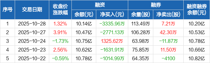 融资方面,当日融资买入1.05亿元,融资偿还1.39亿元,融资净偿还3335.96万元。融券方面,融券卖出8.53万股,融券偿还1.32万股,融券余量113.49万股,融券余额610.58万元。融资融券余额合计10.2亿元。