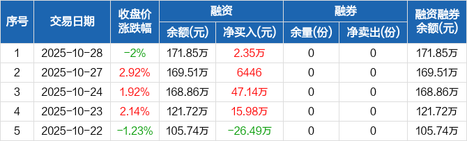 融资方面,当日融资买入155.25万元,融资偿还152.91万元,融资净买入2.35万元,连续4日净买入累计66.11万元。融券方面,融券卖出0份,融券偿还0份,融券余量0份,融券余额0元。融资融券余额合计171.85万元。