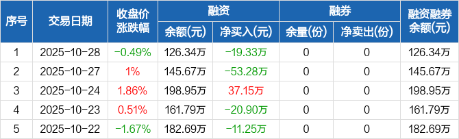 融资方面,当日融资买入68.09万元,融资偿还87.43万元,融资净偿还19.33万元。融券方面,融券卖出0份,融券偿还0份,融券余量0份,融券余额0元。融资融券余额合计126.34万元。