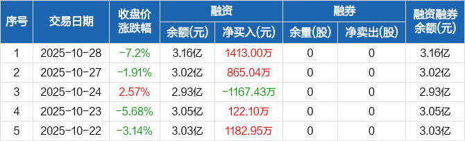 融资方面,当日融资买入9314.24万元,融资偿还7901.24万元,融资净买入1413万元。融券方面,融券卖出0股,融券偿还0股,融券余量0股,融券余额0元。融资融券余额合计3.16亿元。