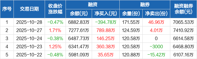 融资方面,当日融资买入834.75万元,融资偿还1229.53万元,融资净偿还394.78万元。融券方面,融券卖出48.96万份,融券偿还2万份,融券余量171.55万份,融券余额182.7万元。融资融券余额合计7065.53万元。