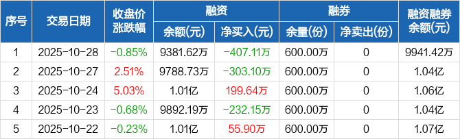 融资方面,当日融资买入1582.45万元,融资偿还1989.56万元,融资净偿还407.11万元。融券方面,融券卖出0份,融券偿还0份,融券余量600万份,融券余额559.8万元。融资融券余额合计9941.42万元。