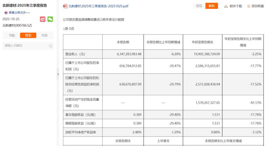 公开资料显示,北新建材为中国建材集团绿色建筑新材料产业平台,以石膏板、防水材料、涂料三大业务为核心。今年三季度,北新建材实现营业收入63.47亿元,同比减少6.2%,实现归属上市公司股东的净利润6.57亿元,同比减少29.47%。