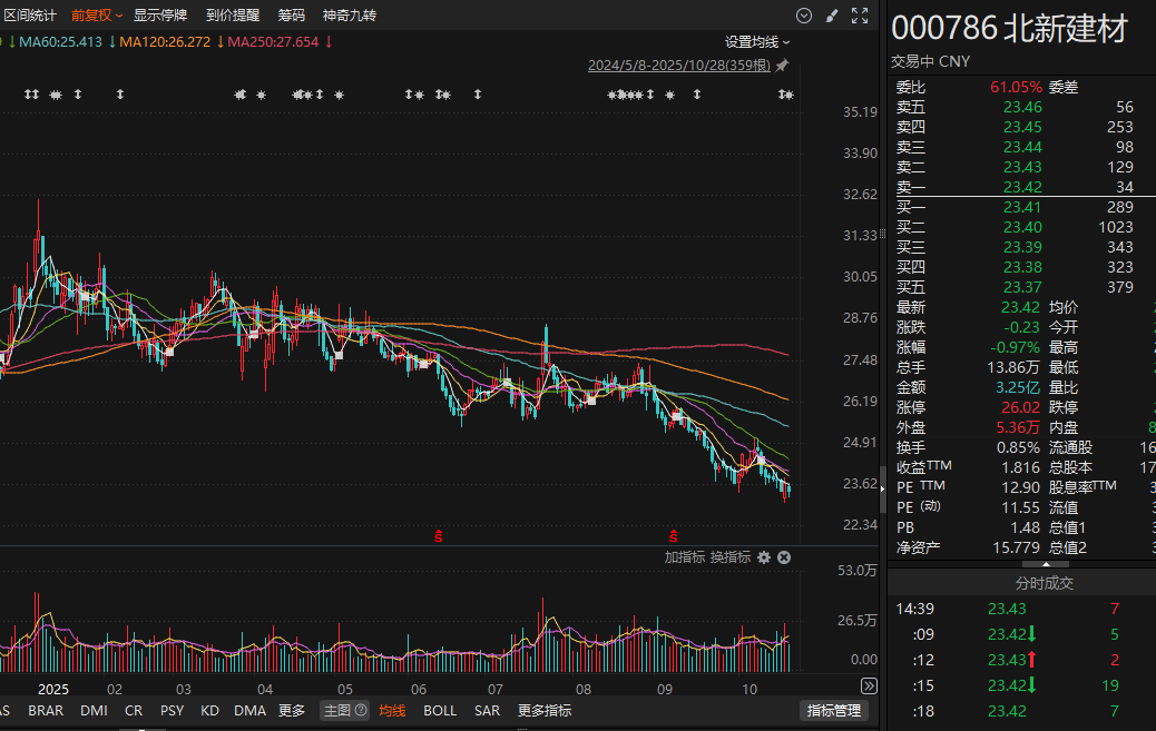业绩承压下,北新建材今年以来股价震荡下行,截至10月28日收盘,该公司股价跌幅超过20%。